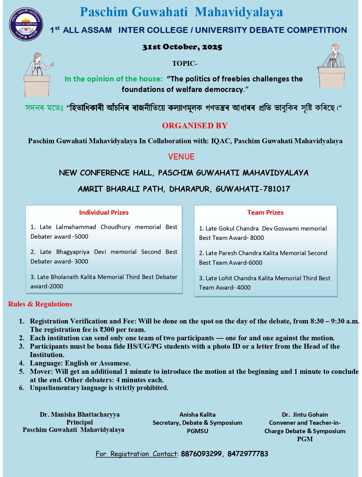 First Inter College University/Debate Competition 2025 organised by Paschim Guwahati Mahavidyalaya