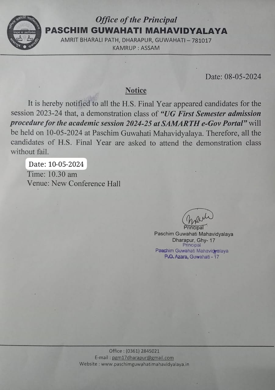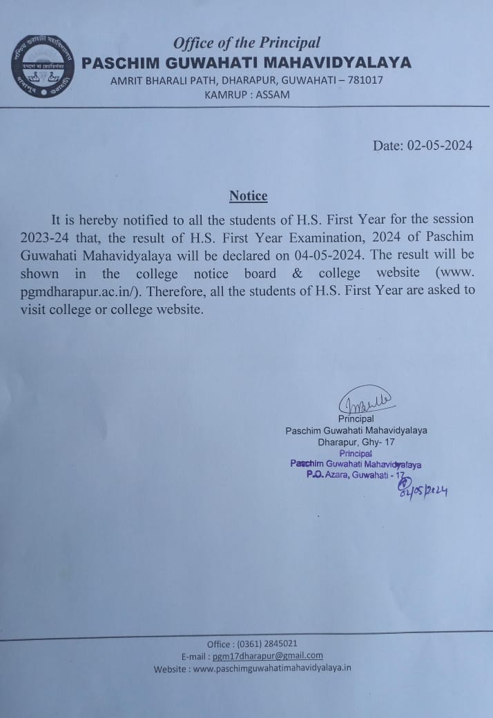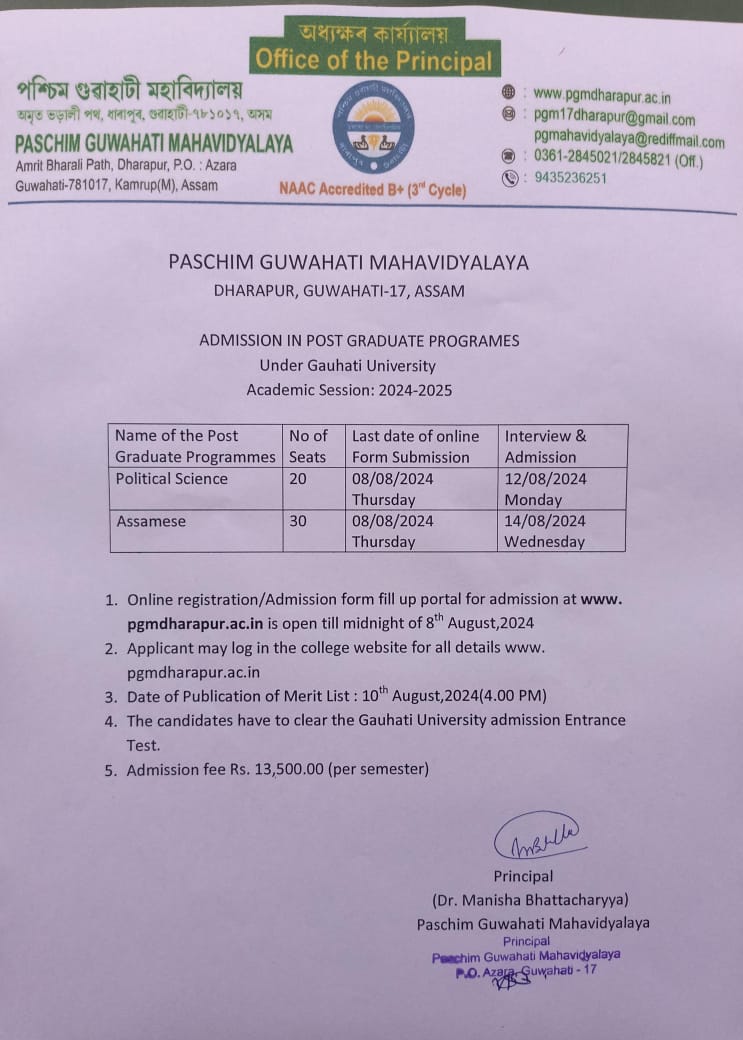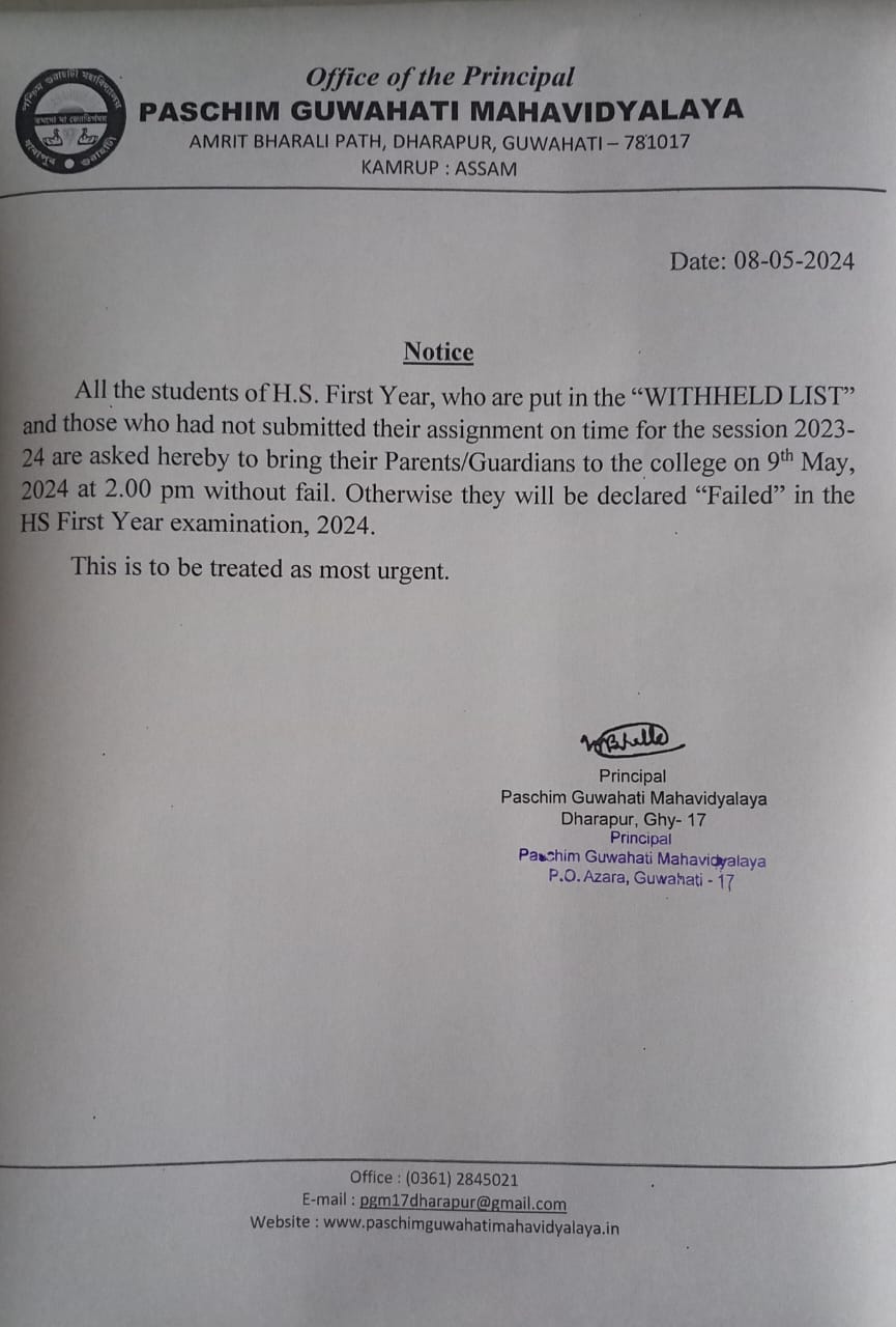 H.S. 1st and H.S. 2nd year Half yearly Examination 2025 View 2025-10-31 HS Final Examination Fees Structure 2026 View 2025-10-24 H.S. Final year Examination form fill up 2026 View 2025-10-19 H.S.1st and 2nd year Half Yearly Examination 2025 View 2025-10-13 H.S. 2nd year Aadhar Number submitted College View 2025-10-13 Form fill-up Notice 2025-26 View 2025-10-09 PGMSU Election notice-1 View 2025-09-18 Scholarship(Fresh & Renewal) 2025 View 2025-08-23 Samarth enrolment number of B.A 1st semester, 2025 View 2025-08-18 Samarth enrolment number of B.com 1st semester, 2025 View 2025-08-18 H.S. 1st year Registration 2025-26 View 2025-08-16 Subject change notification for newly admitted students of paschim Guwahati Mahavidyalaya View 2025-08-12 BA/B.com/BCA 1st semester Major and Minor subject change View 2025-08-12 Merit list Post Graduate Assamese 2025 View 2025-08-06 Merit List Post Graduate(Political Science) 2025 View 2025-08-05 B.A & B.Com 3rd & 5th semester Admission Notice 2025 View 2025-07-22 BA & B.com 3rd and 5th semester Admission Notice 2025 View 2025-07-22 Notice regarding FYUGP(B.A/B.Com) 3rd and 5th semester admission for the session 2025-26 View 2025-07-21 PG Admission Notice for Political Science & Assamese 2025 View 2025-07-10 Scholarship Opportunity from Geeta University View 2025-06-26 Admission Notice View 2025-06-19 Notice regarding Darpan Online Admission View 2025-06-18 2nd Merit List for admission into BA Course of Paschim Guwahati Mahavidyalaya View 2025-06-12 2nd Merit List for admission into B. Com Course of Paschim Guwahati Mahavidyalaya View 2025-06-12 2nd Merit List for admission into BCA Course of Paschim Guwahati Mahavidyalaya View 2025-06-12 BCA Merit List 2025-26 View 2025-06-03 B.Com Merit List 2025-26 View 2025-06-03 BA Merit List 2025-26 View 2025-06-03 Admission Notice View 2025-05-26 Timeline for UG admission 2025-26 View 2025-05-09 Admission Process manual-Registration and admission process for FYUGP 1st Semester View 2025-05-09 Classes of HS 2nd Year for the session 2025-26 View 2025-05-06 Class Routine for even semesters of Commerce, January to June, 2025 View 2025-02-04 Class Routine for even semesters of Arts, January to June, 2025 View 2025-02-04 FYUGP 1ST & 3RD SEM EXAM FORM FILL UP NOTIFICATION 2024 View 2024-12-03 Election Notice View 2024-09-26 HS 1st Year Registration Card Distribution For the Session 2023-24 View 2024-08-20 Roll no. of HS 1st Year(Commerce), 2024-25 View 2024-08-19 Roll no. of HS 1st Year(Arts), 2024-25 View 2024-08-19 Office Notice 13/08/2024 View 2024-08-13 Important Notice for Students 09/08/2024 View 2024-08-09 Walk in Interview (Dept. of Pol. Science) View 2024-08-03 CLASS ROUTINE FOR COMMERCE STREAM 2024-25 View 2024-08-03 CLASS ROUTINE FOR ARTS STREAM 2024-25 View 2024-08-03 Admission in PG Programmes for the academic session 2024-25 View 2024-08-02 Walk in Interview for the post of IT Associate View 2024-07-18 Cutoff Percentage of 2nd Merit list View 2024-06-25 Admission Notice FYUGP BA, B.Com. & BCA (2024-25) View 2024-06-14 Celebration of World environment day 2024. View 2024-06-04 Urgent notification for BA/B.Com./BCA 2nd Semester Examination, 2024 View 2024-06-01 Timelines for FYUGP admission 2024-25 View 2024-05-25 Admission notice by DHE, 2024_2025 View 2024-05-25 Question Paper design of BA 2nd Semester Examination. View 2024-05-24 SEC 2nd Semester examination notice View 2024-05-24 Notice of writing for the 2023-24 college megazine. View 2024-05-22 Admission Notice for HS 2nd Year, 2024-25 View 2024-05-22 Registration link for BCA Students(2024-25) View 2024-05-22 H.S. 1st Year Commerce Merit List for Unreserved Category View 2024-05-18 H.S. 1st Year Arts Merit List for Unreserved Category View 2024-05-18 H.S. 1st Year Arts Waiting List for Reserved Category View 2024-05-18 H.S. 1st Year Arts Waiting List for Unreserved Category View 2024-05-18 H.S. 1st Year Commerce Merit List for Reserved Category View 2024-05-18 H.S. 1st Year Commerce Merit List for Reserved Category View 2024-05-18 Notification for Rechecking of answer scripts (HS Final Examination) View 2024-05-15 H. S. 2nd year class notice View 2024-05-10 H. S. First Year Notice View 2024-05-08 Demonstration class of UG First Semester admission procedure for the academic session 2024-25 View 2024-05-08 H. S. First Year Result View 2024-05-04 Faculty Development Programme on "E-content development & Digital Mode of Teaching" View 2024-05-04 Class Attendance Notice, H. S. 2nd year. View 2024-05-02 H. S. First Year Notice. View 2024-05-02 PG Examination form fillup notice. Students can fill-up the examination form through their own log in. Last date 10/05/2024 View 2024-04-24 Online Training on NEP orientation & Sensitization Programme organised by UGC-MMTTC(Formerly HRDC) Gauhati University In collaboration with Paschim Guwahati Mahavidyalaya, Ghy-17 View 2024-04-22 Celebration of World Earth Day. Seminar on UN-sustainable development goal(SDG) organised by IQAC, Paschim Guwahati Mahavidyalaya. 22nd April, 2024 View 2024-04-22 Admission open for the session 2024-2025 View 2024-04-19 B.A., B.COM 2ND SEMESTER FINAL EXAMINATION SCHEDULE 2024 View 2024-04-10 B.A., B.COM 6th Semester (CBCS) FINAL EXAMINATION SCHEDULE 2024 View 2024-04-10 B.A., B.COM 4th Semester (CBCS) FINAL EXAMINATION SCHEDULE 2024 View 2024-04-10