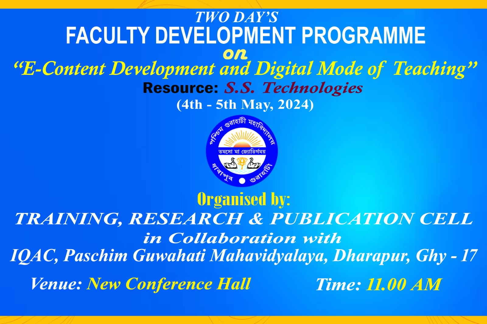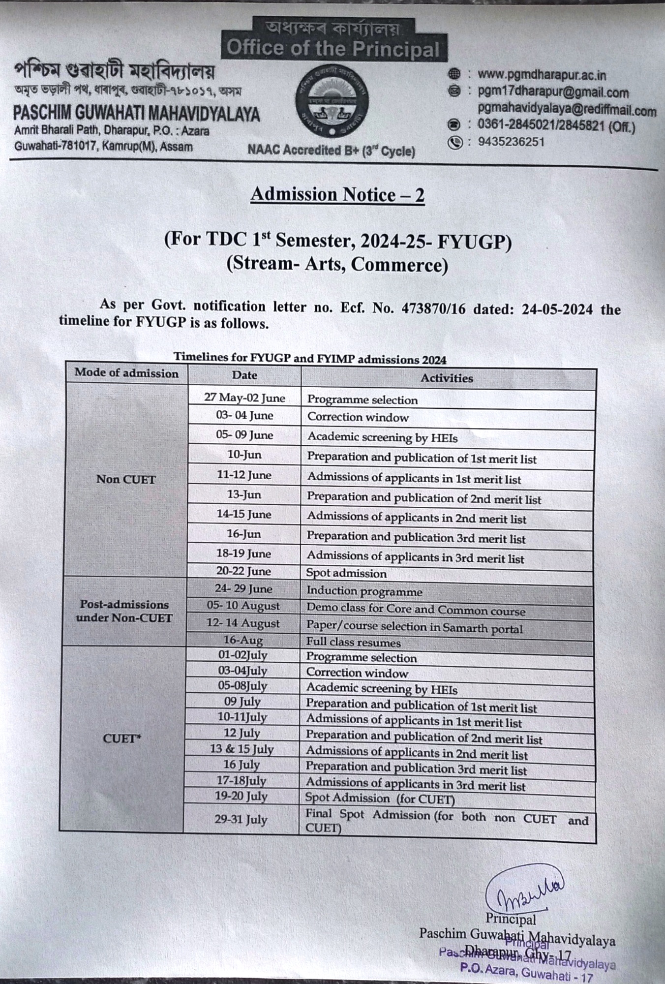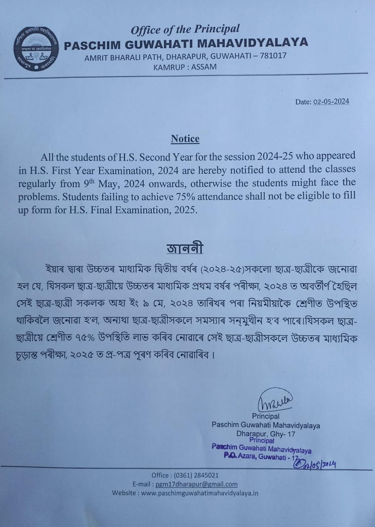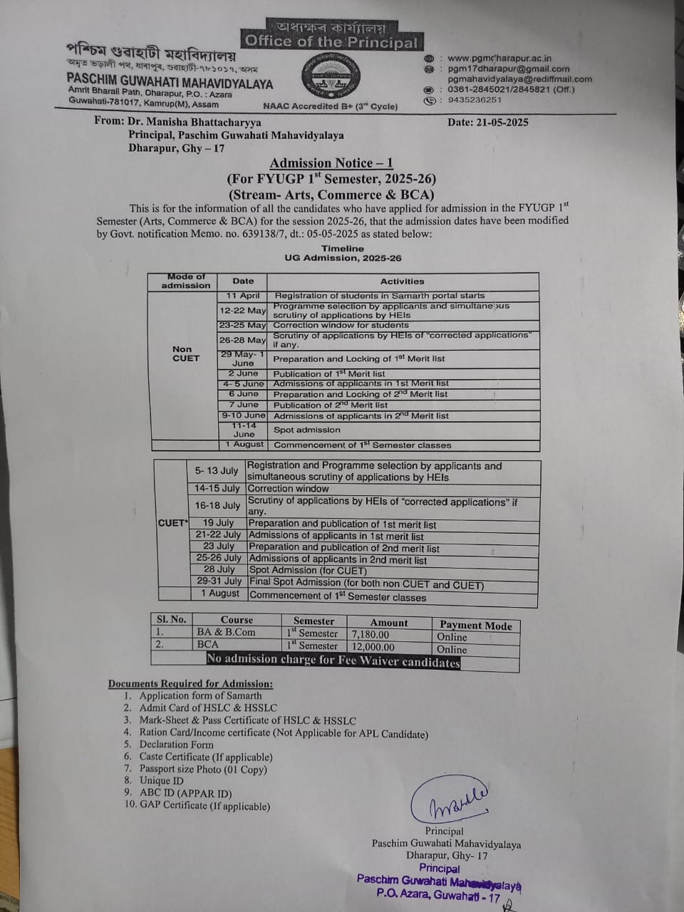 H.S. 1st and H.S. 2nd year Half yearly Examination 2025 View 2025-10-31 HS Final Examination Fees Structure 2026 View 2025-10-24 H.S. Final year Examination form fill up 2026 View 2025-10-19 H.S.1st and 2nd year Half Yearly Examination 2025 View 2025-10-13 H.S. 2nd year Aadhar Number submitted College View 2025-10-13 Form fill-up Notice 2025-26 View 2025-10-09 PGMSU Election notice-1 View 2025-09-18 Scholarship(Fresh & Renewal) 2025 View 2025-08-23 Samarth enrolment number of B.A 1st semester, 2025 View 2025-08-18 Samarth enrolment number of B.com 1st semester, 2025 View 2025-08-18 H.S. 1st year Registration 2025-26 View 2025-08-16 Subject change notification for newly admitted students of paschim Guwahati Mahavidyalaya View 2025-08-12 BA/B.com/BCA 1st semester Major and Minor subject change View 2025-08-12 Merit list Post Graduate Assamese 2025 View 2025-08-06 Merit List Post Graduate(Political Science) 2025 View 2025-08-05 B.A & B.Com 3rd & 5th semester Admission Notice 2025 View 2025-07-22 BA & B.com 3rd and 5th semester Admission Notice 2025 View 2025-07-22 Notice regarding FYUGP(B.A/B.Com) 3rd and 5th semester admission for the session 2025-26 View 2025-07-21 PG Admission Notice for Political Science & Assamese 2025 View 2025-07-10 Scholarship Opportunity from Geeta University View 2025-06-26 Admission Notice View 2025-06-19 Notice regarding Darpan Online Admission View 2025-06-18 2nd Merit List for admission into BA Course of Paschim Guwahati Mahavidyalaya View 2025-06-12 2nd Merit List for admission into B. Com Course of Paschim Guwahati Mahavidyalaya View 2025-06-12 2nd Merit List for admission into BCA Course of Paschim Guwahati Mahavidyalaya View 2025-06-12 BCA Merit List 2025-26 View 2025-06-03 B.Com Merit List 2025-26 View 2025-06-03 BA Merit List 2025-26 View 2025-06-03 Admission Notice View 2025-05-26 Timeline for UG admission 2025-26 View 2025-05-09 Admission Process manual-Registration and admission process for FYUGP 1st Semester View 2025-05-09 Classes of HS 2nd Year for the session 2025-26 View 2025-05-06 Class Routine for even semesters of Commerce, January to June, 2025 View 2025-02-04 Class Routine for even semesters of Arts, January to June, 2025 View 2025-02-04 FYUGP 1ST & 3RD SEM EXAM FORM FILL UP NOTIFICATION 2024 View 2024-12-03 Election Notice View 2024-09-26 HS 1st Year Registration Card Distribution For the Session 2023-24 View 2024-08-20 Roll no. of HS 1st Year(Commerce), 2024-25 View 2024-08-19 Roll no. of HS 1st Year(Arts), 2024-25 View 2024-08-19 Office Notice 13/08/2024 View 2024-08-13 Important Notice for Students 09/08/2024 View 2024-08-09 Walk in Interview (Dept. of Pol. Science) View 2024-08-03 CLASS ROUTINE FOR COMMERCE STREAM 2024-25 View 2024-08-03 CLASS ROUTINE FOR ARTS STREAM 2024-25 View 2024-08-03 Admission in PG Programmes for the academic session 2024-25 View 2024-08-02 Walk in Interview for the post of IT Associate View 2024-07-18 Cutoff Percentage of 2nd Merit list View 2024-06-25 Admission Notice FYUGP BA, B.Com. & BCA (2024-25) View 2024-06-14 Celebration of World environment day 2024. View 2024-06-04 Urgent notification for BA/B.Com./BCA 2nd Semester Examination, 2024 View 2024-06-01 Timelines for FYUGP admission 2024-25 View 2024-05-25 Admission notice by DHE, 2024_2025 View 2024-05-25 Question Paper design of BA 2nd Semester Examination. View 2024-05-24 SEC 2nd Semester examination notice View 2024-05-24 Notice of writing for the 2023-24 college megazine. View 2024-05-22 Admission Notice for HS 2nd Year, 2024-25 View 2024-05-22 Registration link for BCA Students(2024-25) View 2024-05-22 H.S. 1st Year Commerce Merit List for Unreserved Category View 2024-05-18 H.S. 1st Year Arts Merit List for Unreserved Category View 2024-05-18 H.S. 1st Year Arts Waiting List for Reserved Category View 2024-05-18 H.S. 1st Year Arts Waiting List for Unreserved Category View 2024-05-18 H.S. 1st Year Commerce Merit List for Reserved Category View 2024-05-18 H.S. 1st Year Commerce Merit List for Reserved Category View 2024-05-18 Notification for Rechecking of answer scripts (HS Final Examination) View 2024-05-15 H. S. 2nd year class notice View 2024-05-10 H. S. First Year Notice View 2024-05-08 Demonstration class of UG First Semester admission procedure for the academic session 2024-25 View 2024-05-08 H. S. First Year Result View 2024-05-04 Faculty Development Programme on "E-content development & Digital Mode of Teaching" View 2024-05-04 Class Attendance Notice, H. S. 2nd year. View 2024-05-02 H. S. First Year Notice. View 2024-05-02 PG Examination form fillup notice. Students can fill-up the examination form through their own log in. Last date 10/05/2024 View 2024-04-24 Online Training on NEP orientation & Sensitization Programme organised by UGC-MMTTC(Formerly HRDC) Gauhati University In collaboration with Paschim Guwahati Mahavidyalaya, Ghy-17 View 2024-04-22 Celebration of World Earth Day. Seminar on UN-sustainable development goal(SDG) organised by IQAC, Paschim Guwahati Mahavidyalaya. 22nd April, 2024 View 2024-04-22 Admission open for the session 2024-2025 View 2024-04-19 B.A., B.COM 2ND SEMESTER FINAL EXAMINATION SCHEDULE 2024 View 2024-04-10 B.A., B.COM 6th Semester (CBCS) FINAL EXAMINATION SCHEDULE 2024 View 2024-04-10 B.A., B.COM 4th Semester (CBCS) FINAL EXAMINATION SCHEDULE 2024 View 2024-04-10